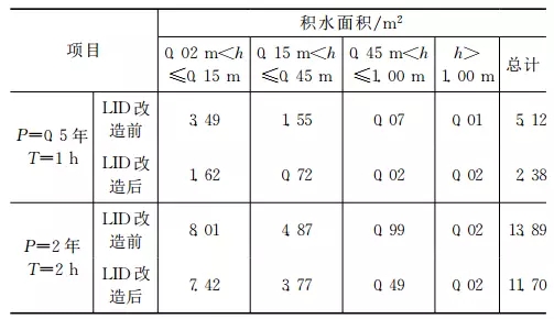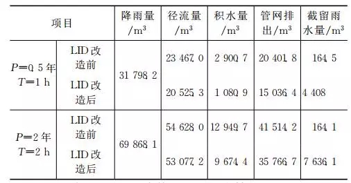 LID改造工程經(jīng)受起了暴雨的考驗,其對雨水徑流的削減控制有明顯的效果,特別是重現(xiàn)期較短歷時較短的降雨。經(jīng)改造后區(qū)域內(nèi)的地表徑流量減少,同時截留的雨水量增加,區(qū)域管網(wǎng)排出系統(tǒng)量有明顯的減少,中心城區(qū)呈現(xiàn)出“海綿吸水”的功能,大大地減輕了城市洪澇現(xiàn)象產(chǎn)生。