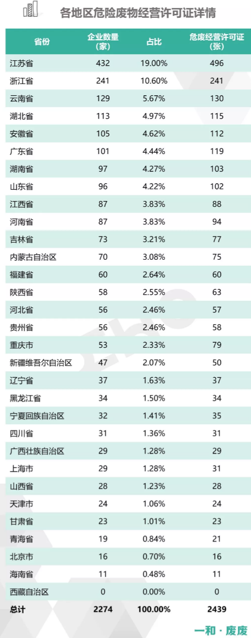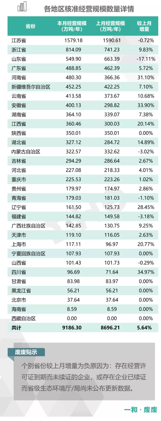 2.統(tǒng)計(jì)范圍:本次數(shù)據(jù)收集統(tǒng)計(jì)的范圍為省級(jí)生態(tài)環(huán)境廳(局)官方公布的持有危險(xiǎn)廢物經(jīng)營(yíng)許可證企業(yè)的數(shù)據(jù),因此由地級(jí)市發(fā)布的醫(yī)療廢物經(jīng)營(yíng)許可證、收集經(jīng)營(yíng)許可證,且未納入省級(jí)生態(tài)環(huán)境廳(局)公布數(shù)據(jù)的部分,并未計(jì)入統(tǒng)計(jì)數(shù)據(jù)中。