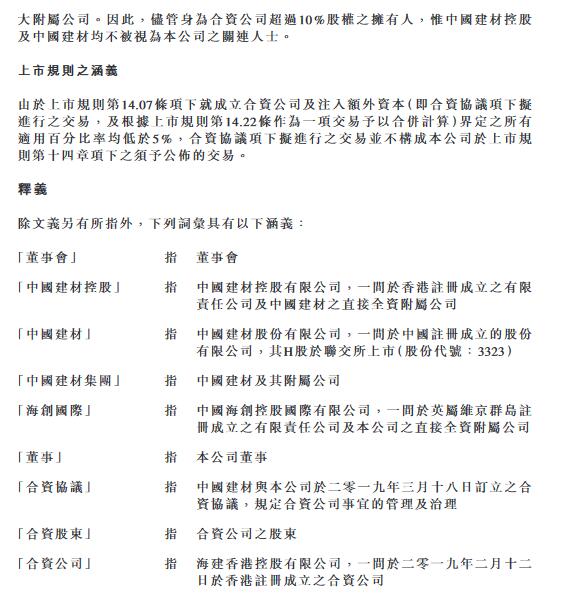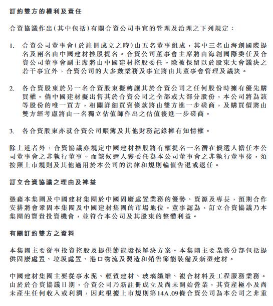 根據(jù)合資協(xié)議,合資協(xié)議訂約雙方合作目標及范圍為由合資公司于中國成立一間有限責(zé)任公司(即外商獨資企業(yè)),主要目的為于中國從事固廢處置業(yè)務(wù)。外商獨資企業(yè)將全權(quán)負責(zé)投資(不論以控股、參股或其他投資方式)、經(jīng)營及管理中國建材從事水泥相關(guān)業(yè)務(wù)的若干附屬公司(關(guān)聯(lián)水泥企業(yè))現(xiàn)有及未來的固廢處置業(yè)務(wù),預(yù)計規(guī)劃處置總產(chǎn)能不少于300萬噸/年。