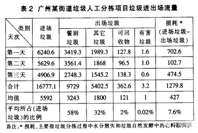 根據(jù)多年的垃圾調(diào)查實(shí)踐,并連續(xù)三天對廣州某街道垃圾人工分揀項(xiàng)目的調(diào)查,在每天平均3人工作7小時(shí)、在垃圾分揀平臺(tái)(平臺(tái)設(shè)置濾水、通風(fēng)除臭)上,主要將生活垃圾分為餐廚垃圾和其它垃圾兩大類,并揀出其中少量的塑料瓶和玻璃,分揀垃圾量和各類垃圾成分結(jié)果如表2所示。