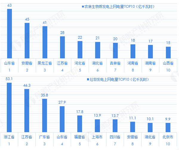 從各省市的生物質(zhì)發(fā)電上網(wǎng)電量的規(guī)模排行來看,山東省、浙江省和廣東省分別為農(nóng)林生物質(zhì)發(fā)電上網(wǎng)電量、垃圾發(fā)電上網(wǎng)電量和沼氣發(fā)電上網(wǎng)電量的擁有量的第一位,規(guī)模分別為63億千瓦時、53.1億千瓦時和2.93億千瓦時。安徽省、黑龍江省、江蘇省、河北省、湖北省和吉林省得農(nóng)林生物質(zhì)發(fā)電上網(wǎng)電量均超過20億千瓦時;江蘇省、廣東省和山東省的垃圾發(fā)電上網(wǎng)電量也在20億千瓦時之上;沼氣發(fā)電的規(guī)模整體較少,除了廣東之外,江西、河南、江蘇、浙江、湖南和北京的沼氣發(fā)電上網(wǎng)電量也排在前列。
