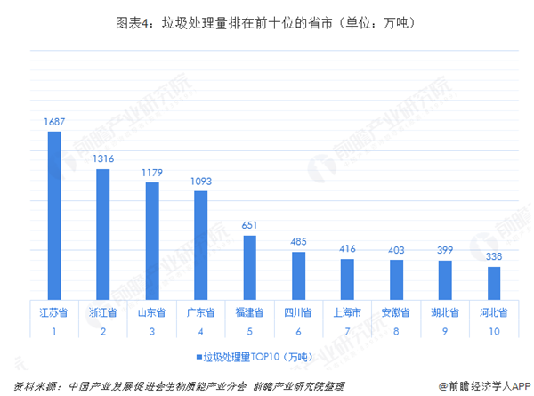 從垃圾處理量排行來看,江蘇省、浙江、山東和廣東地區(qū)的處理量均超過1000萬噸,分列第1到第4位。福建、四川、上海、安徽、湖北和河北的處理量也較多。