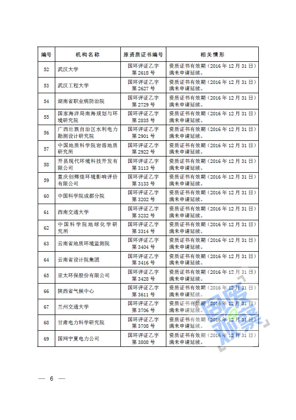 根據(jù)《建設(shè)項(xiàng)目環(huán)境影響評(píng)價(jià)資質(zhì)管理辦法》(環(huán)境保護(hù)部令第36號(hào))的有關(guān)規(guī)定,我部對(duì)建設(shè)項(xiàng)目環(huán)境影響評(píng)價(jià)資質(zhì)(以下簡(jiǎn)稱資質(zhì))證書(shū)有效期滿未申請(qǐng)延續(xù)的69家機(jī)構(gòu)資質(zhì)予以注銷(xiāo)(具體名單詳見(jiàn)附件)。