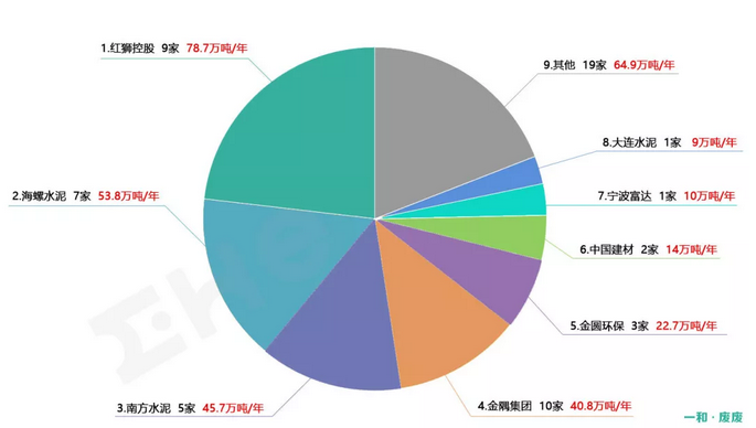 注:9家僅處置HW33的企業(yè)利用水泥窯處理黃金冶煉氰化尾渣,由于其成分與鐵礦石接近,高溫分解其中有害物質(zhì)后直接作為生產(chǎn)水泥的原料使用;1家僅處理HW34的企業(yè)是通過(guò)石膏制硫酸聯(lián)產(chǎn)水泥技術(shù)。