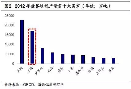 我國(guó)城鎮(zhèn)垃圾產(chǎn)量巨大。根據(jù)國(guó)家統(tǒng)計(jì)局?jǐn)?shù)據(jù),2000年我國(guó)的常住人口城鎮(zhèn)化率僅為36.22%,到2015年末為56.1%,年均增加1.33個(gè)百分點(diǎn),城鎮(zhèn)人口的不斷增加使得城鎮(zhèn)生活垃圾產(chǎn)生量與日俱增。根據(jù)OECD數(shù)據(jù),2012年我國(guó)垃圾清運(yùn)量?jī)H次于美國(guó),高居世界第二位,且遙遙領(lǐng)先于后面的俄羅斯、巴西、德國(guó)等國(guó)家。根據(jù)國(guó)家統(tǒng)計(jì)局?jǐn)?shù)據(jù),2001年我國(guó)垃圾清運(yùn)量為1.35億噸,2015年為1.91億噸,CAGR為3.27%。