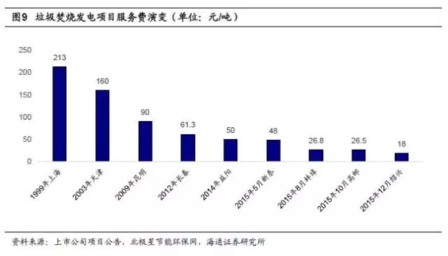行業(yè)競(jìng)爭(zhēng)加劇,處理費(fèi)下行。在市場(chǎng)參與者逐漸增多和行業(yè)競(jìng)爭(zhēng)逐步加劇的背景下,近年新建的垃圾焚燒項(xiàng)目處理費(fèi)呈下降趨勢(shì)。2015年以來,一些企業(yè)為了搶占市場(chǎng)而壓低價(jià)格,低價(jià)中標(biāo)項(xiàng)目涌現(xiàn):2015年山東新泰項(xiàng)目中標(biāo)價(jià)48元/噸,安徽蚌埠項(xiàng)目中標(biāo)價(jià)26.8元/噸,江蘇高郵項(xiàng)目中標(biāo)價(jià)26.5元/噸,浙江紹興項(xiàng)目中標(biāo)價(jià)更是降至18元,擾亂市場(chǎng)正常秩序。除去少數(shù)惡意壓低價(jià)格的項(xiàng)目,根據(jù)中國(guó)經(jīng)濟(jì)導(dǎo)報(bào)統(tǒng)計(jì),近年來垃圾焚燒特許經(jīng)營(yíng)項(xiàng)目處理費(fèi)每噸平均在60~80元,整體呈現(xiàn)小幅下降的趨勢(shì)。