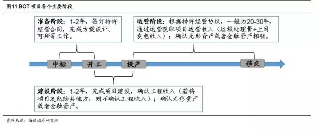 對(duì)項(xiàng)目公司而言,項(xiàng)目中標(biāo)后,主要會(huì)經(jīng)歷三個(gè)階段,分別是準(zhǔn)備階段(一般為1-2年,完成項(xiàng)目的前期準(zhǔn)備工作,簽訂特許經(jīng)營(yíng)合同,完成環(huán)評(píng)、可研報(bào)告等工作)、建設(shè)階段(一般為1-2年,完成項(xiàng)目建設(shè),確認(rèn)工程收入,若項(xiàng)目外包給其他方,則不確認(rèn))和運(yùn)營(yíng)階段(在特許經(jīng)營(yíng)期內(nèi),負(fù)責(zé)項(xiàng)目的運(yùn)營(yíng),獲取垃圾處理費(fèi)補(bǔ)貼和上網(wǎng)發(fā)電收入),特許經(jīng)營(yíng)期到期之后,項(xiàng)目無償移交給政府。