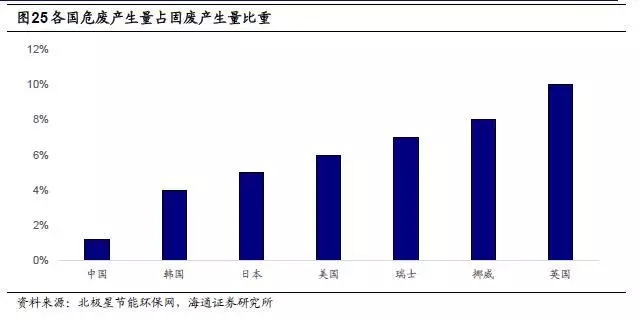 另一方面,我國(guó)危廢的實(shí)際產(chǎn)生量可能遠(yuǎn)遠(yuǎn)高于環(huán)境統(tǒng)計(jì)年報(bào)的統(tǒng)計(jì)數(shù)據(jù),很多危廢產(chǎn)生量未進(jìn)入國(guó)家統(tǒng)計(jì)口徑。根據(jù)2010年發(fā)布的《第一次全國(guó)污染源普查公報(bào)》,2007年全國(guó)工業(yè)危廢產(chǎn)量為4573.69萬噸,已遠(yuǎn)超2015年環(huán)境統(tǒng)計(jì)年報(bào)的值。根據(jù)國(guó)外經(jīng)驗(yàn),危廢產(chǎn)生量占固廢的比重基本都在4%以上,英國(guó)更是達(dá)到10%,參考日本、韓國(guó)的數(shù)據(jù),假設(shè)中國(guó)危廢實(shí)際產(chǎn)生量占固廢比重為4%,基于環(huán)境統(tǒng)計(jì)年報(bào)數(shù)據(jù),我國(guó)2015年工業(yè)危廢產(chǎn)生量大約為1.3億噸,尚有約9000萬噸的工業(yè)危廢沒有被納入統(tǒng)計(jì)口徑,差異主要來自于危廢產(chǎn)生企業(yè)對(duì)危廢的少報(bào)瞞報(bào),部分危廢流向沒有危廢經(jīng)營(yíng)資質(zhì)的企業(yè)處置。若以危廢實(shí)際產(chǎn)生量來看,目前危廢的有效綜合利用處置處置率還非常低,提升空間大。