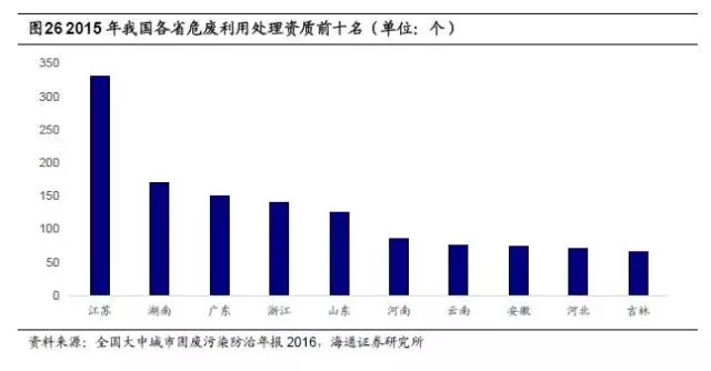 我國(guó)危廢綜合利用與處置行業(yè)格局分散,市場(chǎng)集中度較低。2015年全國(guó)危廢許可證(含醫(yī)療危廢)數(shù)量為2034個(gè),較前一年增加113個(gè),其中江蘇省頒發(fā)的危廢許可證數(shù)量為327個(gè),數(shù)量上排名第一,湖南、廣東分列二、三位,數(shù)量在150個(gè)左右,浙江、山東也超過100個(gè)。截止到2015年,全國(guó)危險(xiǎn)廢物經(jīng)營(yíng)單位核準(zhǔn)經(jīng)營(yíng)規(guī)模達(dá)到5263萬噸/年,其中核準(zhǔn)利用規(guī)模為4155.1萬噸/年,核準(zhǔn)處置規(guī)模為982.4萬噸/年,平均每個(gè)許可證僅對(duì)應(yīng)2.59萬噸/年的利用和處置能力。根據(jù)2008年環(huán)保部公布的危廢處置名單,當(dāng)時(shí)全國(guó)1500多家具有危廢處理資質(zhì)的企業(yè)中,處理能力達(dá)到1000噸/日的企業(yè)僅占0.3%,目前行業(yè)格局沒有太大變化。