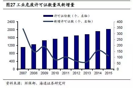 我國(guó)政府對(duì)危廢處理行業(yè)實(shí)行許可證制度。這一方面能夠保證從事危廢處理業(yè)務(wù)的公司基本擁有較強(qiáng)的技術(shù)實(shí)力和項(xiàng)目經(jīng)驗(yàn),從而保障危廢無害化處理的效率,減少處理不當(dāng)造成的二次污染;另一方面,實(shí)行許可證制度會(huì)限制新進(jìn)企業(yè)數(shù)量,限制全國(guó)危廢綜合利用和處置總量。
