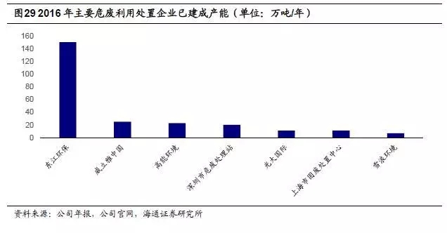 東江環(huán)保龍頭地位顯著。截止2016年底,東江環(huán)保已擁有國(guó)家危險(xiǎn)廢物名錄中46大類中的44類危廢經(jīng)營(yíng)資質(zhì),僅次于威立雅中國(guó),公司危廢利用和處置資質(zhì)近150萬噸/年(其中無害化處置資質(zhì)達(dá)到72萬噸/年),遠(yuǎn)遠(yuǎn)高于威立雅中國(guó),另根據(jù)公司規(guī)劃,預(yù)計(jì)到2020年總產(chǎn)能將達(dá)到350萬噸(其中無害化產(chǎn)能達(dá)到200萬噸),增長(zhǎng)空間可觀。