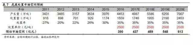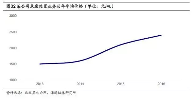 危廢處置價(jià)格穩(wěn)步上升,市場(chǎng)空間巨大。從核準(zhǔn)經(jīng)營(yíng)規(guī)??矗U處置產(chǎn)能緊缺,2015年核準(zhǔn)處置規(guī)模僅982.4萬噸/年。近年來,危廢處置價(jià)格呈現(xiàn)穩(wěn)步上升趨勢(shì)。以行業(yè)內(nèi)某領(lǐng)先企業(yè)為例,2013年,其危廢處置業(yè)務(wù)平均價(jià)格為1500元/噸左右,2016年則上升至2500元/噸左右。以全國(guó)環(huán)境統(tǒng)計(jì)公報(bào)數(shù)據(jù)為基礎(chǔ),假設(shè)未來幾年危廢產(chǎn)生量保持過去十年復(fù)合增長(zhǎng)率12%的增速,保守估計(jì)處置率為35%,單位處置成本為2500元/噸,則預(yù)計(jì)2020年危廢處置市場(chǎng)為613億元,2017-2020處置市場(chǎng)空間總計(jì)2086億元??紤]到還有大量的危廢沒有進(jìn)入國(guó)家統(tǒng)計(jì)口徑,若將這些量考慮在內(nèi),市場(chǎng)空間還將提升2-3倍。