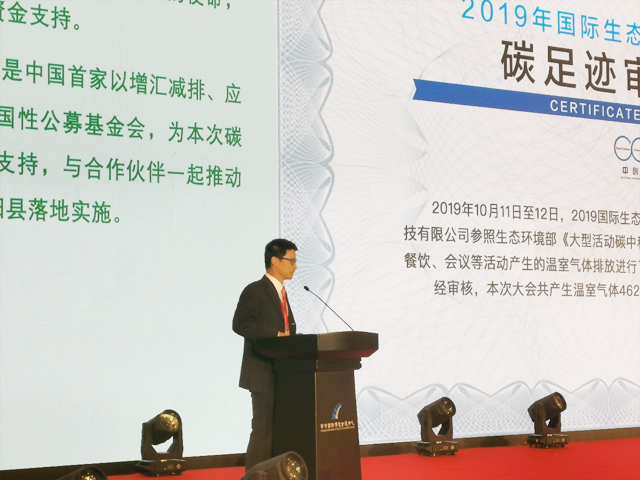 在生態(tài)環(huán)境部莊國泰副部長、江蘇省人民政府郭元強(qiáng)副省長等領(lǐng)導(dǎo)及嘉賓的見證下,北京中創(chuàng)碳投科技有限公司副總經(jīng)理錢國強(qiáng)先生宣讀了大會(huì)溫室氣體排放量并出具審核證書。江蘇省生態(tài)環(huán)境廳應(yīng)對(duì)氣候與國際合作處王華處長為中創(chuàng)碳投頒發(fā)了碳中和紀(jì)念證書。