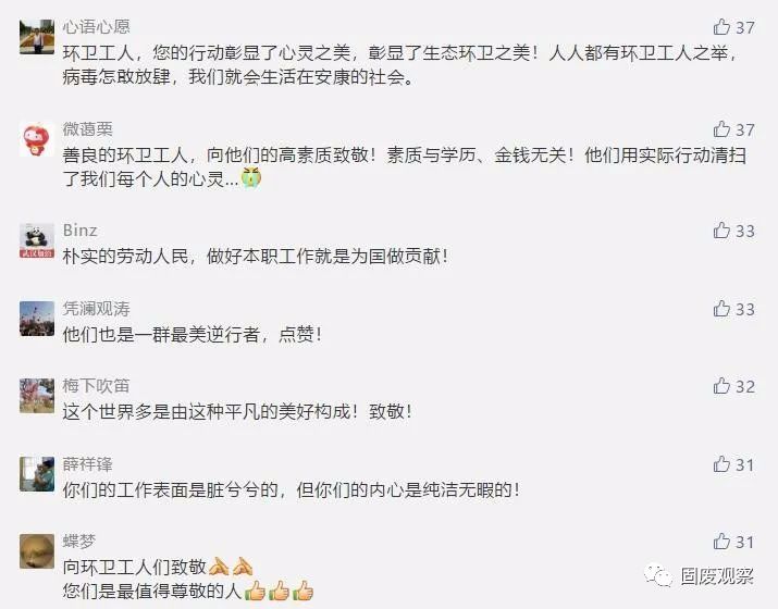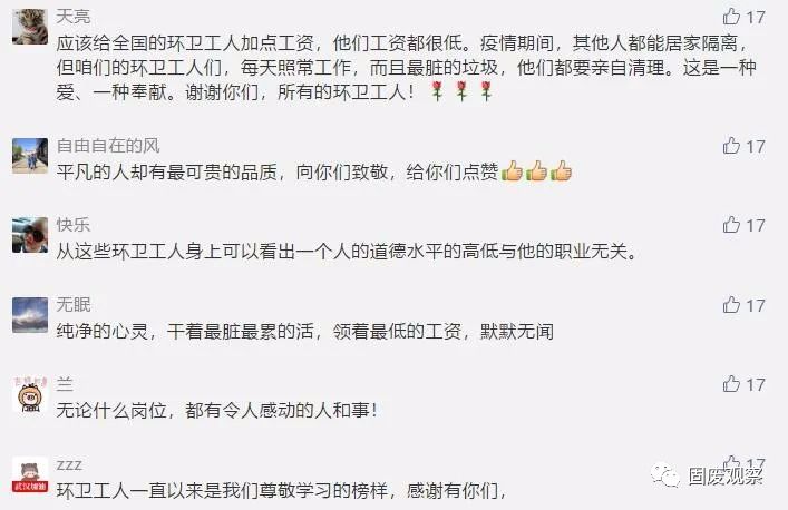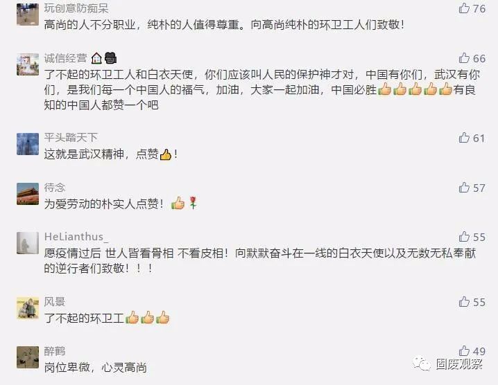 近日,荊楚網(wǎng)一篇《武漢隔離的環(huán)衛(wèi)工退房后,酒店經(jīng)理邊查房邊抹淚》的微信,讓無(wú)數(shù)讀者落淚,并紛紛點(diǎn)贊:“她們是最美最可敬的人!”“平凡的崗位造就了不平凡的人”“他們不僅打掃看得見的垃圾,還能清潔我們心靈里的灰塵”“我含著眼淚向這群擁有最美心靈的姐妹們致敬!”“平凡的人們給我最多感動(dòng)!”