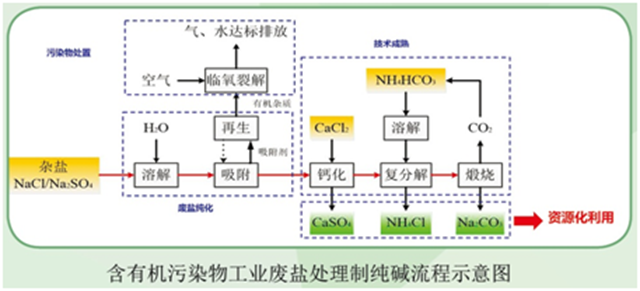 利用吸附-脫附技術(shù)富集工業(yè)廢鹽溶液中的有機(jī)污染物,再通過臨氧裂解技術(shù)實現(xiàn)達(dá)標(biāo)排放,凈化后的鹽溶液進(jìn)入制堿工藝,制堿工藝技術(shù)成熟,從而實現(xiàn)工業(yè)廢鹽的資源化利用。