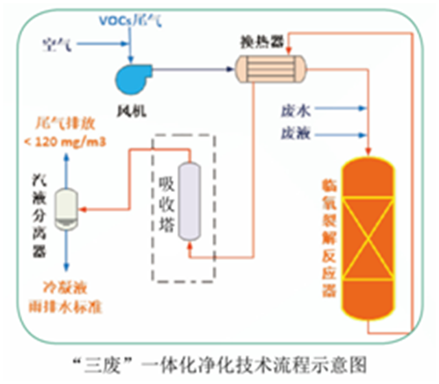 在臨氧裂解反應(yīng)器內(nèi),可以同時處理含有機(jī)污染物的廢氣、廢水和廢液,使氣、水達(dá)標(biāo)排放。