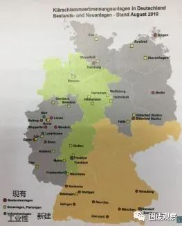 暫存設(shè)施建設(shè)不是為了污泥的處置,而是為了干化能夠與協(xié)同焚燒實現(xiàn)匹配。暫存設(shè)施的生存時間取決于協(xié)同焚燒與獨立焚燒的競爭情況、取決于新建獨立焚燒設(shè)施的投產(chǎn)時間和能力。本文作者認(rèn)為,今后仍然有10%左右的處理后污泥采用土地利用的處置方式,大約每年有17萬t。但是在過渡期后,這一土地利用的量有可能還會減少。圖3是德國現(xiàn)狀和新建設(shè)施的地理分布情況。從焚燒設(shè)施的地域分布看,各州的能力是不平衡的。