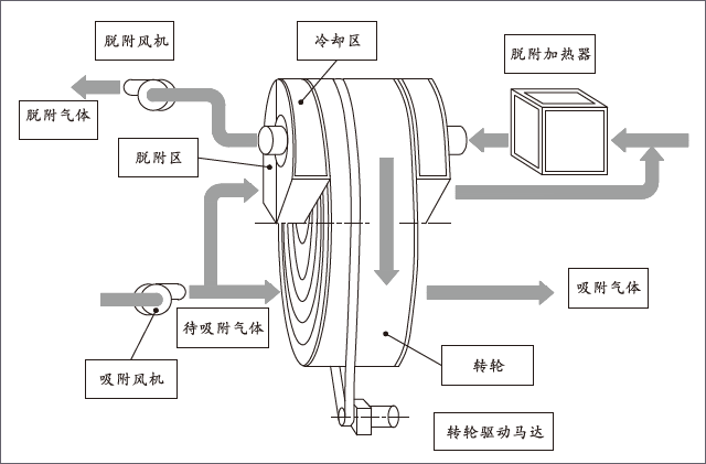 據(jù)介紹,分子篩吸附濃縮轉(zhuǎn)輪分為吸附區(qū)、脫附區(qū)、冷卻區(qū),轉(zhuǎn)輪在各個(gè)區(qū)域連續(xù)運(yùn)轉(zhuǎn)。VOCs廢氣經(jīng)過(guò)濾裝置等預(yù)處理之后,進(jìn)入轉(zhuǎn)輪吸附區(qū)被吸附凈化排除;吸附飽和后的分子篩進(jìn)入脫附區(qū),經(jīng)高溫?zé)犸L(fēng)進(jìn)行脫附濃縮;高溫脫附后的區(qū)域由冷空氣進(jìn)行冷卻再生,用于冷卻的空氣經(jīng)加熱后可以作為再生空氣使用。