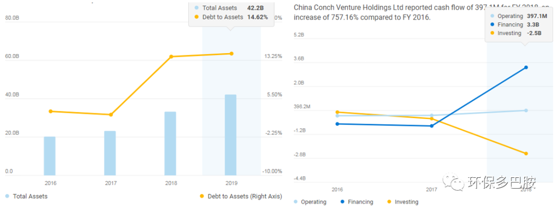 正是出身于這樣一個大家庭,公司成立之初,不僅繼承了海螺良好的管理團隊和文化,同時,海螺水泥優(yōu)秀的財務(wù)表現(xiàn)還使得公司享受穩(wěn)定投資收益和分紅,擁有殷實財務(wù)報表(低負債、高回款和充足現(xiàn)金),可以說是在環(huán)保行業(yè)中是別具一格的富二代,這二者為海螺創(chuàng)業(yè)日后的成功奠定了扎實的基礎(chǔ)。