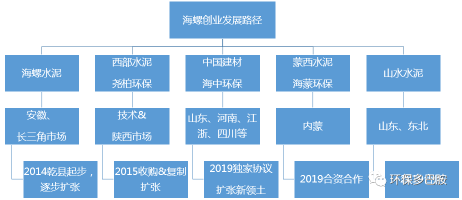 由于水泥行業(yè)市場格局較為固定,為了進入海螺集團影響力較小地區(qū)(海螺主要輻射安徽及長三角地區(qū)),則必須與其他水泥企業(yè)合作。2019年伴隨海創(chuàng)在水泥窯協(xié)同方面技術(shù)的成熟與管理的優(yōu)勢,公司有了將潛在對手變成合作伙伴的資本,從而開啟全國異地擴張節(jié)奏!