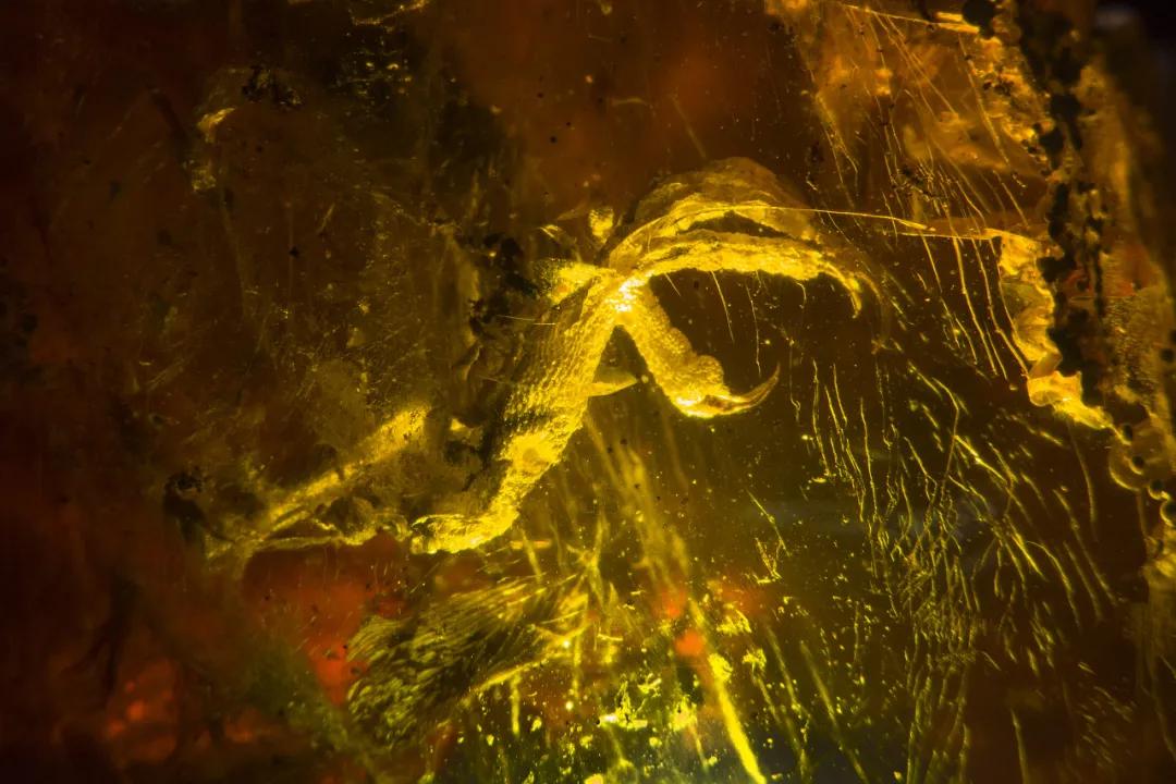 琥珀里的鳥化石,鳥足清晰可見 | 琥珀是古代天然樹脂轉(zhuǎn)化形成的寶石。這塊琥珀標(biāo)本產(chǎn)自緬甸,形成于大約9900萬年前的白堊紀(jì)中晚期,里面包裹著一只幾乎完整的雛鳥,極為罕見。圖源@VCG