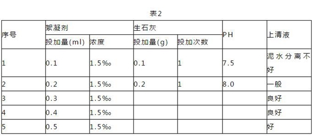 3月18日上午在專業(yè)人員的指導(dǎo)下,我們決定對(duì)2#氧化溝系列采用投生石灰和絮凝劑來控制氧化溝內(nèi)因污泥膨脹產(chǎn)生的褐色泡沫,投生石灰是為了殺死活性污泥中的絲狀菌(利用絲狀菌不能在堿性環(huán)境中生存的原理),投絮凝劑是為了增加活性污泥的沉降性能。首先做小試,確定生石灰和絮凝劑投加量,取2#氧化溝內(nèi)混合液1000ml,首加0.1g生石灰,測(cè)PH值為7.7,再加0.1g生石灰攪拌,測(cè)PH為8.03,小試后確定每升混合液中加0.2g生石灰,換算為每方0.2kg;然后向混合液中加1.5‰的絮凝劑從0.1ml開始加至0.5ml時(shí),混合液的泥水分離較好,上清液變清亮,換算為每方混合液加1.5‰的絮凝劑0.5 kg。