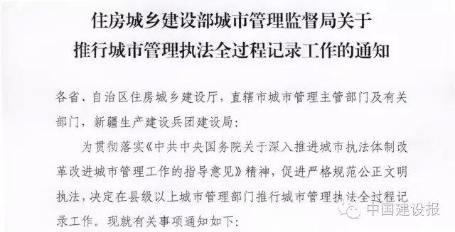 各省、自治區(qū)住房城鄉(xiāng)建設(shè)廳,直轄市城市管理主管部門及有關(guān)部門,新疆生產(chǎn)建設(shè)兵團(tuán)建設(shè)局:為貫徹落實(shí)《中共中央國(guó)務(wù)院關(guān)于深入推進(jìn)城市執(zhí)法體制改革改進(jìn)城市管理工作的指導(dǎo)意見》精神,促進(jìn)嚴(yán)格規(guī)范公正文明執(zhí)法,決定在縣級(jí)以上城市管理部門推行城市管理執(zhí)法全過程記錄工作。現(xiàn)就有關(guān)事項(xiàng)通知如下:各地城市管理部門要通過文字、音像等記錄方式,對(duì)執(zhí)法活動(dòng)全過程進(jìn)行記錄,客觀、公正、完整地記錄執(zhí)法工作情況和相關(guān)證據(jù),實(shí)現(xiàn)全過程留痕和可回溯管理。規(guī)范執(zhí)法文書的制作和使用,確保執(zhí)法文書和案卷完整準(zhǔn)確、合法規(guī)范。合理配備并使用執(zhí)法記錄儀等現(xiàn)場(chǎng)執(zhí)法記錄設(shè)備和視音頻資料傳輸、存儲(chǔ)、等設(shè)備。對(duì)現(xiàn)場(chǎng)執(zhí)法活動(dòng)中容易引發(fā)爭(zhēng)議和糾紛的,應(yīng)當(dāng)實(shí)行全過程音像記錄。積極利用大數(shù)據(jù)、云計(jì)算、物聯(lián)網(wǎng)等信息技術(shù),結(jié)合數(shù)字化城市管理平臺(tái)建設(shè)和辦公自動(dòng)化系統(tǒng)建設(shè)等,探索成本低、效果好、易保存、不能刪改的音像記錄方式,提高執(zhí)法記錄的信息化水平。做好執(zhí)法文書和視音頻資料的管理和存儲(chǔ),逐步實(shí)現(xiàn)與數(shù)字化城市管理信息系統(tǒng)關(guān)聯(lián)共享。建立健全執(zhí)法全過程記錄保存、管理、使用等工作制度。定期組織對(duì)執(zhí)法文書和視音頻資料進(jìn)行抽查檢查。充分發(fā)揮全過程記錄信息在案卷評(píng)查、數(shù)據(jù)統(tǒng)計(jì)分析、執(zhí)法監(jiān)督等工作中的作用。各地要充分認(rèn)識(shí)推行城市管理執(zhí)法全過程記錄工作的重要意義,切實(shí)落實(shí)工作要求,配備相關(guān)儀器設(shè)備,嚴(yán)格規(guī)范記錄行為,妥善保管使用記錄信息,確保執(zhí)法全過程記錄工作有效推行。住房城鄉(xiāng)建設(shè)部城市管理監(jiān)督局