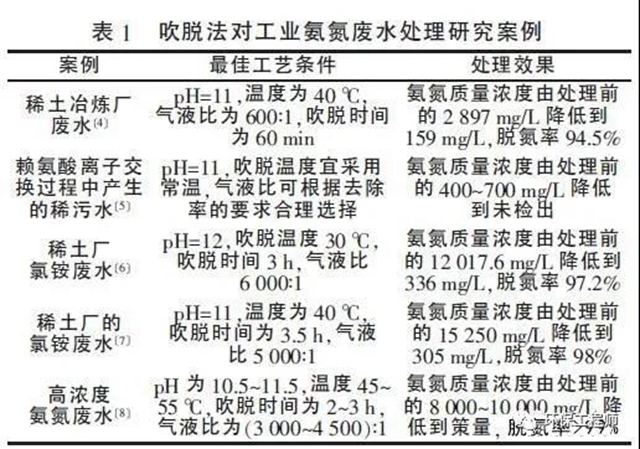 通過(guò)對(duì)比分析表1 可以得出:(1)吹脫法普遍適宜的pH 在11 附近;(2)考慮經(jīng)濟(jì)因素,溫度在30~40 ℃附近較為可行,且處理率高;(3)吹脫時(shí)間為3 h左右;(4)氣液比在5 000∶1 左右效果較好,且吹脫溫度越高,氣液比越?。?5)吹脫后廢水的濃度可降低到中低濃度;(6)脫氮率基本保持90%以上。盡管吹脫法可以將大部分氨氮脫除, 但處理后的廢水中氨氮仍然高達(dá)100 mg/L 以上,無(wú)法直接排放,還需要后續(xù)深度處理