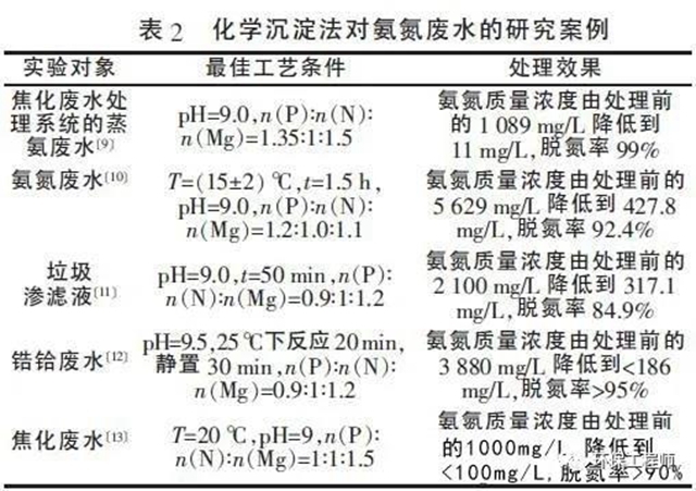 化學(xué)沉淀法的優(yōu)點(diǎn)主要表現(xiàn)在:工藝設(shè)計(jì)操作相對(duì)簡(jiǎn)單;反應(yīng)穩(wěn)定,受外界環(huán)境影響小,抗沖擊能力強(qiáng);脫氮率高,效果明顯,生成的磷酸銨鎂可作為無(wú)機(jī)復(fù)合肥使用,解決了氮的回收和二次污染的問(wèn)題,具有良好的經(jīng)濟(jì)和環(huán)境效益。磷酸銨鎂沉淀法適用于處理氨氮濃度較高的工業(yè)廢水, 表2 總結(jié)了一些使用化學(xué)沉淀法處理氨氮廢水的案例。