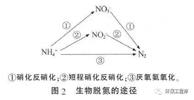 生物法是指廢水中的氨氮在各種微生物作用下,通過(guò)硝化、反硝化等一系列反應(yīng)最終生成氮?dú)?,從而達(dá)到去除的目的,其脫氮途徑如圖2 所示。對(duì)于可生化性高的廢水(BOD/COD>0.3),氨氮可通過(guò)生物法脫除。