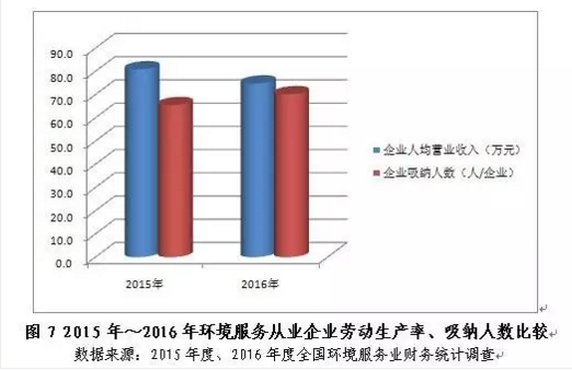 2016年,環(huán)境服務(wù)從業(yè)企業(yè)人均營業(yè)收入74.8萬元,同比下跌7.5%。從業(yè)企業(yè)勞動生產(chǎn)率的小幅下滑可能與企業(yè)吸納從業(yè)人數(shù)的增長有關(guān),2016年業(yè)內(nèi)企業(yè)平均吸納人數(shù)為70人/企業(yè),同比提高7.2%。