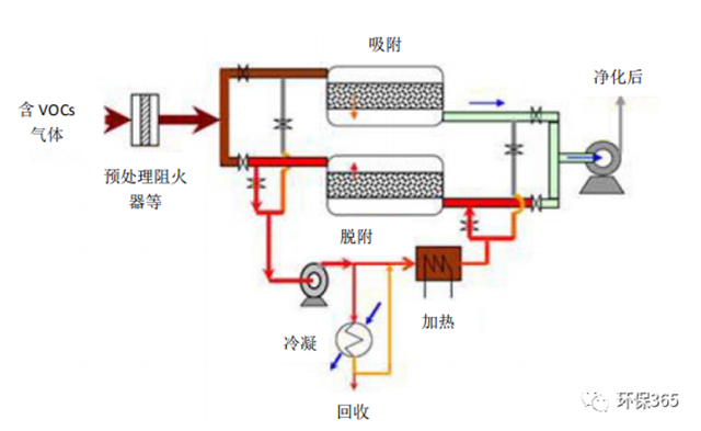 該技術(shù)采用多級冷凝技術(shù),使廢氣的有機(jī)成分在常壓下凝結(jié)成液體析出,經(jīng)凈化后的廢氣進(jìn)入吸附器進(jìn)一步吸附富集,同時確保達(dá)標(biāo)排放。吸附飽和后的吸附劑(活性炭、沸石等)等采用負(fù)壓脫附方式再生吸附劑,并將高濃度 VOCs 送回前端冷凝裝置。
