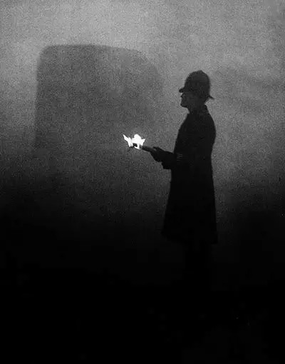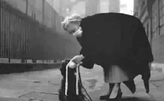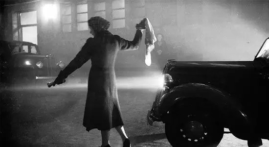 1938年的倫敦,一名女子拿手電筒給霧霾中的車引路。