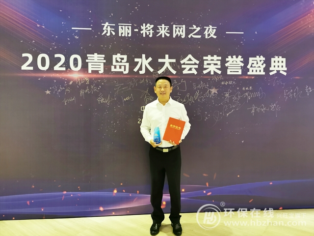 圖為本屆青島水大會(huì) 天創(chuàng)環(huán)境市場部總監(jiān)程志軍代表企業(yè)上臺(tái)獲獎(jiǎng)