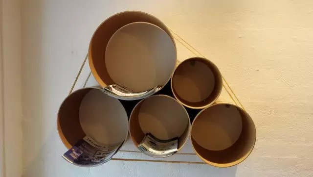 各種大小的紙筒做的掛墻儲(chǔ)物格