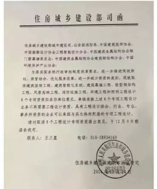 8個(gè)工程設(shè)計(jì)專項(xiàng)資質(zhì)包括:建筑裝飾工程,建筑智能化系統(tǒng),建筑幕墻工程,輕型鋼結(jié)構(gòu)工程,照明工程,消防設(shè)施工程,風(fēng)景園林工程和環(huán)境工程,向城市建設(shè)司、公安部消防局,中國(guó)建筑裝飾協(xié)會(huì),中國(guó)勘察設(shè)計(jì)協(xié)會(huì)工程智能設(shè)計(jì)分會(huì),中國(guó)建筑金屬結(jié)構(gòu)協(xié)會(huì),中國(guó)建筑環(huán)境保護(hù)產(chǎn)業(yè)協(xié)會(huì)發(fā)出此征求意見(jiàn)函,要求在12月9日之前給予回復(fù)。