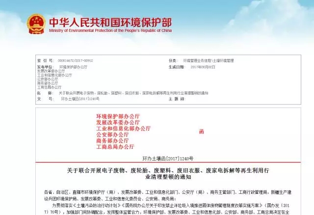 為貫徹落實《土壤污染防治行動計劃》《國務院辦公廳關于印發(fā)禁止洋垃圾入境推進固體廢物管理制度改革實施方案》(國辦發(fā)〔2017〕70號),加強部門間協(xié)調(diào)配合,發(fā)揮整體監(jiān)管合力,環(huán)境保護部、發(fā)展改革委、工業(yè)和信息化部、公安部、商務部、工商總局決定在全國范圍內(nèi)開展電子廢物、廢輪胎、廢塑料、廢舊衣服、廢家電拆解等再生利用行業(yè)清理整頓?,F(xiàn)將《電子廢物、廢輪胎、廢塑料、廢舊衣服、廢家電拆解等再生利用行業(yè)清理整頓工作方案》印發(fā)給你們,請結(jié)合本地實際,抓好貫徹落實。
