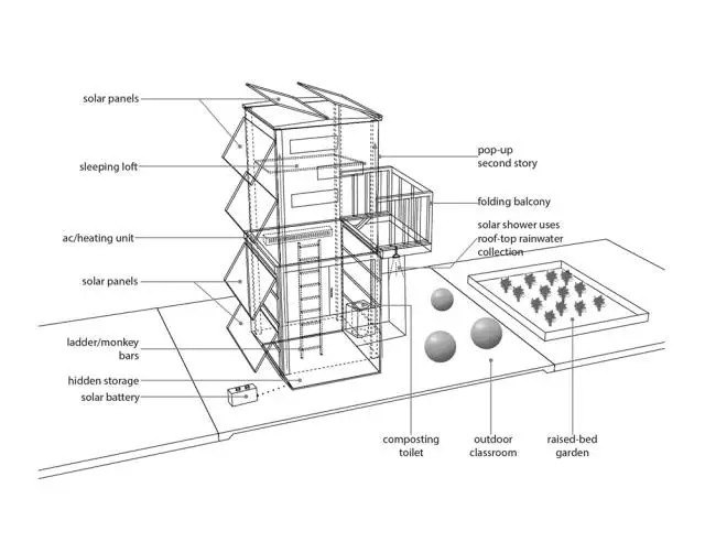 屋頂設(shè)計成三角形,不僅可以自由移動給室內(nèi)通風(fēng),還內(nèi)藏太陽能發(fā)電板。