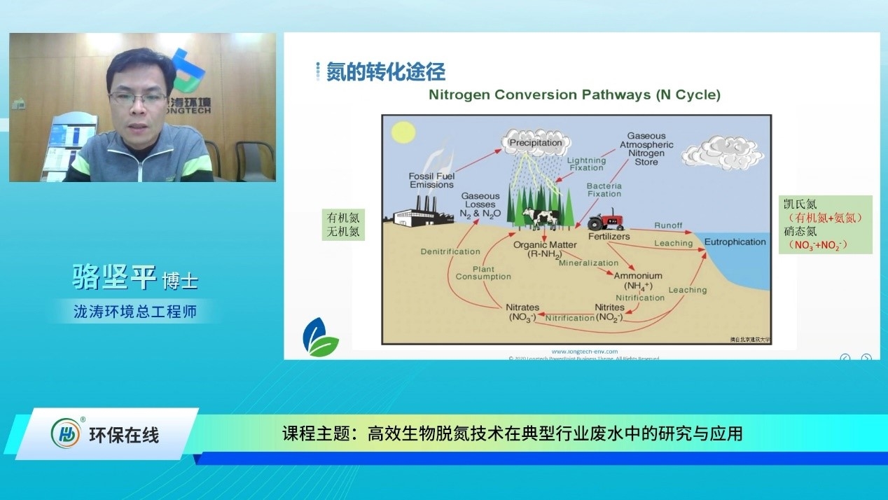 課程直播中,駱博士從生物脫氮原理、影響因素、脫氮工藝及案例等3個(gè)主要方面進(jìn)行了闡述,對(duì)傳統(tǒng)脫氮工藝的優(yōu)缺點(diǎn)展開剖析,詳細(xì)講解了短程硝化反硝化、厭氧氨氧化等新型脫氮技術(shù)的工藝流程與優(yōu)勢,并分享了化學(xué)合成制藥廢水、屠宰廢水、工業(yè)坑塘廢水等具體應(yīng)用案例。