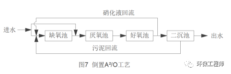 與常規(guī)的A2/O工藝相比,倒置A2/O工藝(見圖7)從前往后以此為缺氧-厭氧-好氧,該工藝的設(shè)計初衷是為了降低污泥回流中硝態(tài)氮對厭氧釋磷的影響,特別是對于高氨氮廢水污泥回流中攜帶有大量的硝氮,抑制厭氧釋磷反應(yīng)。同時,為了解決碳源分配的問題,采用兩點進(jìn)水的方式來提供厭氧釋磷中有機(jī)物的消耗。