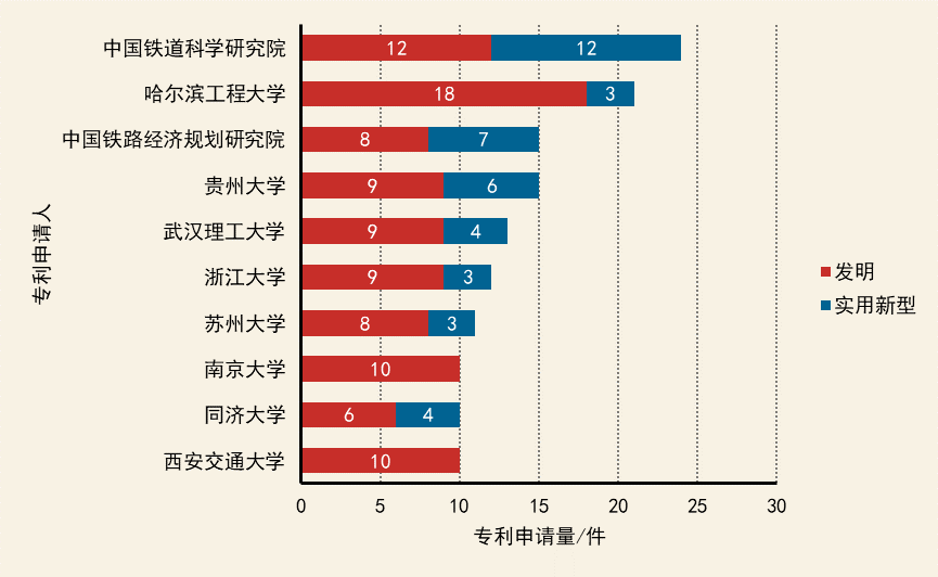中國國內院校在該技術領域的專利申請量偏少。排在前三位的高校/科研院所分別是中國鐵道科學研究院、哈爾濱工程大學、中國鐵路經濟規(guī)劃研究院。