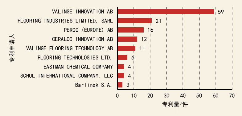 物理污染控制技術領域核心專利持有機構有:VALINGE INNOVATION AB、FLOORING INDUSTRIES LIMITED, SARL、PERGO (EUROPE) AB、CERALOC INNOVATION AB、VALINGE FLOORING TECHNOLOGY AB。