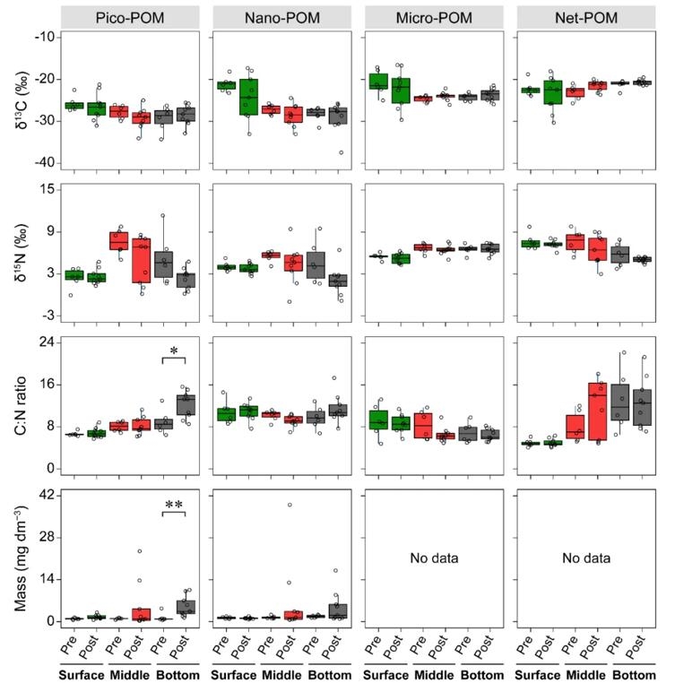 圖2 臺風(fēng)前后顆粒有機(jī)物碳氮同位素、化學(xué)計量和質(zhì)量的變化