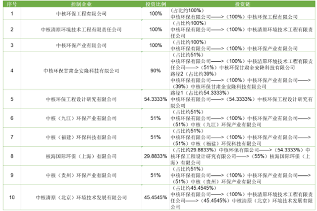 中國(guó)水網(wǎng)發(fā)現(xiàn),在中核環(huán)保所控制的27家企業(yè)中,環(huán)保企業(yè)共10家,包括中核清原環(huán)境技術(shù)工程有限責(zé)任公司,以及中核環(huán)保工程有限公司、中核環(huán)保產(chǎn)業(yè)有限公司、中核環(huán)保甘肅金安隆科技有限公司等,具體公司名稱、投資比例、投資鏈見下表。