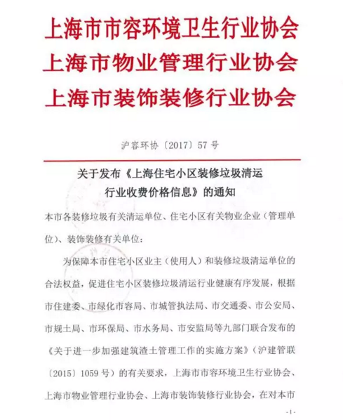 《上海市住宅小區(qū)裝修垃圾清運(yùn)行業(yè)收費(fèi)價(jià)格信息》全文內(nèi)容如下: