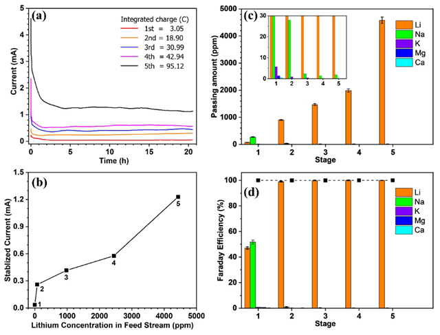 圖2.(a)提鋰過程中每一級(jí)的計(jì)時(shí)電流曲線,曲線與時(shí)間的積分即為該過程中遷移的總電荷量;(b)提鋰過程中穩(wěn)定電流與原料鋰濃度的關(guān)系;(c)提鋰過程中每一級(jí)的離子通過量;插圖顯示情節(jié)在低范圍內(nèi),以幫助查看干擾離子的結(jié)果:(d)提鋰過程中每一級(jí)中不同離子的遷移對(duì)電流的貢獻(xiàn)率。實(shí)心方塊表示總體效率(100%)。