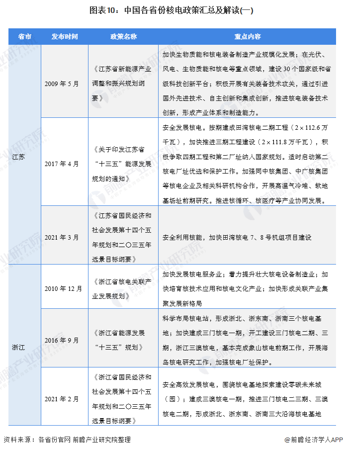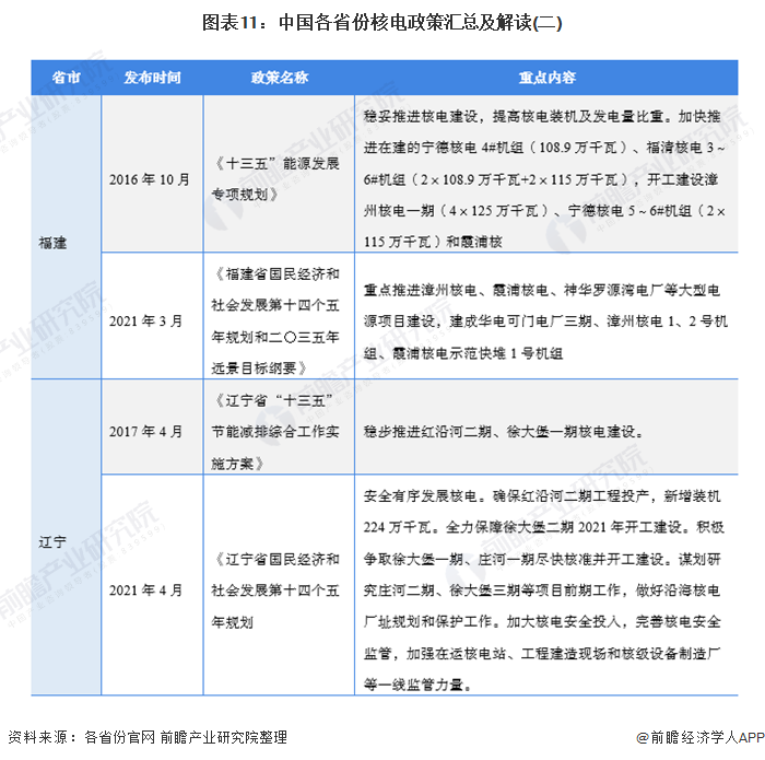 現(xiàn)有或規(guī)劃在建的核電站省份包括:江蘇、浙江、福建、山東、遼寧、廣西、廣東和海南,各省份均在“十三五”、“十四五”時期發(fā)布了推動核電建設(shè)的支持性政策,政策內(nèi)容均落實了“安全高效發(fā)展核電產(chǎn)業(yè)”的主旨: