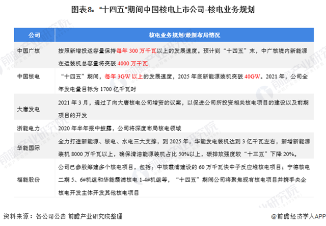 根據(jù)“十四五規(guī)劃和2035年愿景目標(biāo)綱要”,“十四五”期間,我國核電運(yùn)行裝機(jī)容量達(dá)到7000萬千瓦。據(jù)此,核電行業(yè)的中國廣核、中國核電也相應(yīng)提出了其十四五發(fā)展目標(biāo),中國廣核表示將保持每年300萬千瓦以上發(fā)展速度,中國核電表示每年將保持3GW以上的發(fā)展速度。此外,核電企業(yè)的其他上市公司也明確了其核電業(yè)務(wù)的發(fā)展布局: