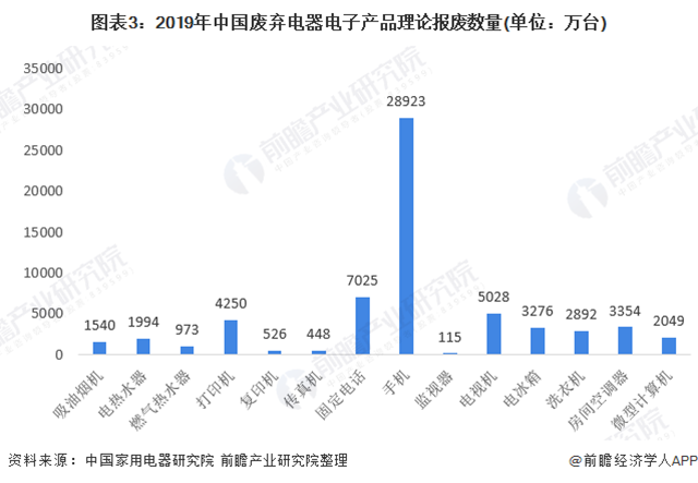 在新公布的《廢棄電器電子產(chǎn)品處理目錄(2014年版)》中,類型有所增加,包含電視機、電冰箱、洗衣機、房間空調(diào)器、微型計算機、吸油煙機、電熱水器、燃氣熱水器、打印機、復(fù)印機、傳真機、固定電話、手機、監(jiān)視器等14類產(chǎn)品。從各類廢棄電器電子產(chǎn)品理論報廢數(shù)量上看,2019年,手機理論報廢量較大,遠多于其他廢棄電器電子產(chǎn)品,達28923萬臺。