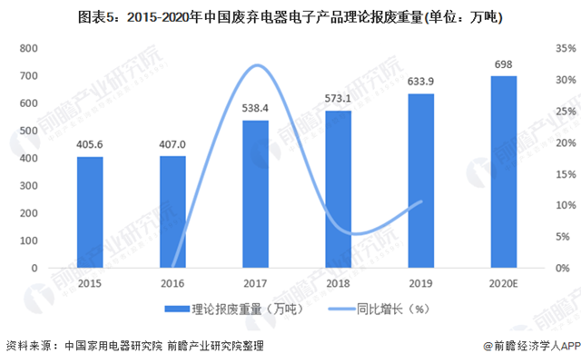 根據(jù)中國家用電器研究院數(shù)據(jù)顯示,2015年以來,我國廢棄電器電子產(chǎn)品理論報廢重量逐年上升,2019年,我國廢棄電器電子產(chǎn)品理論報廢重量達633.9萬噸,2020年約接近700萬噸。